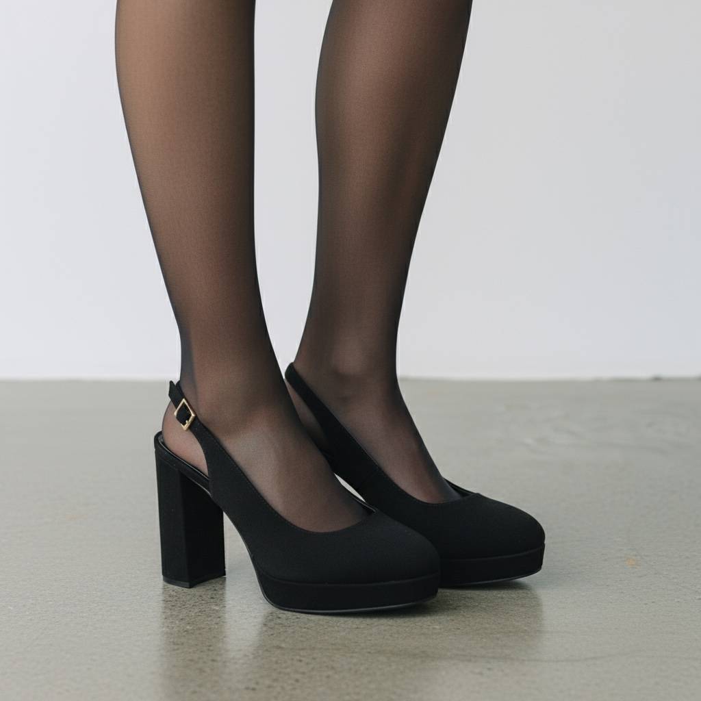 Κομψές και σταθερές γόβες με ανοιχτή φτέρνα (slingback) και ρυθμιζόμενο λουράκι με μεταλλική αγκράφα.