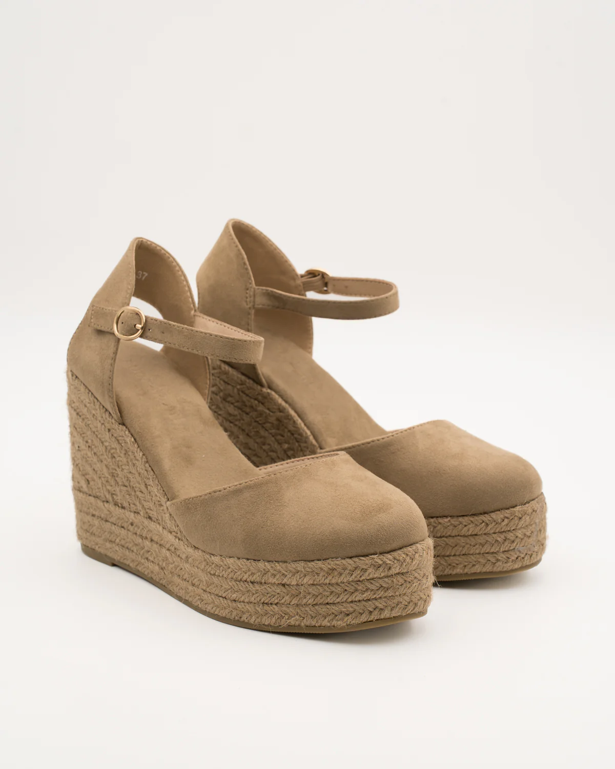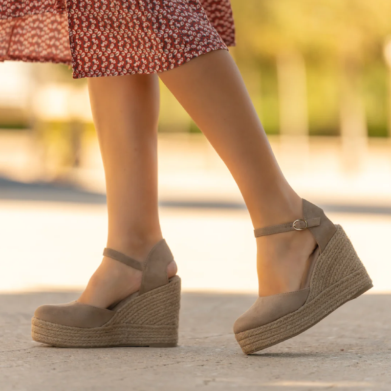 Γυναικείο πέδιλο πλατφόρμα σε μπεζ απόχρωση, κατασκευασμένο από συνθετικό suede με υφή καστόρι. Διαθέτει σταθερή πλατφόρμα τύπου espadrille και λουράκι στον αστράγαλο με αγκράφα για άνετη και ασφαλή εφαρμογή.