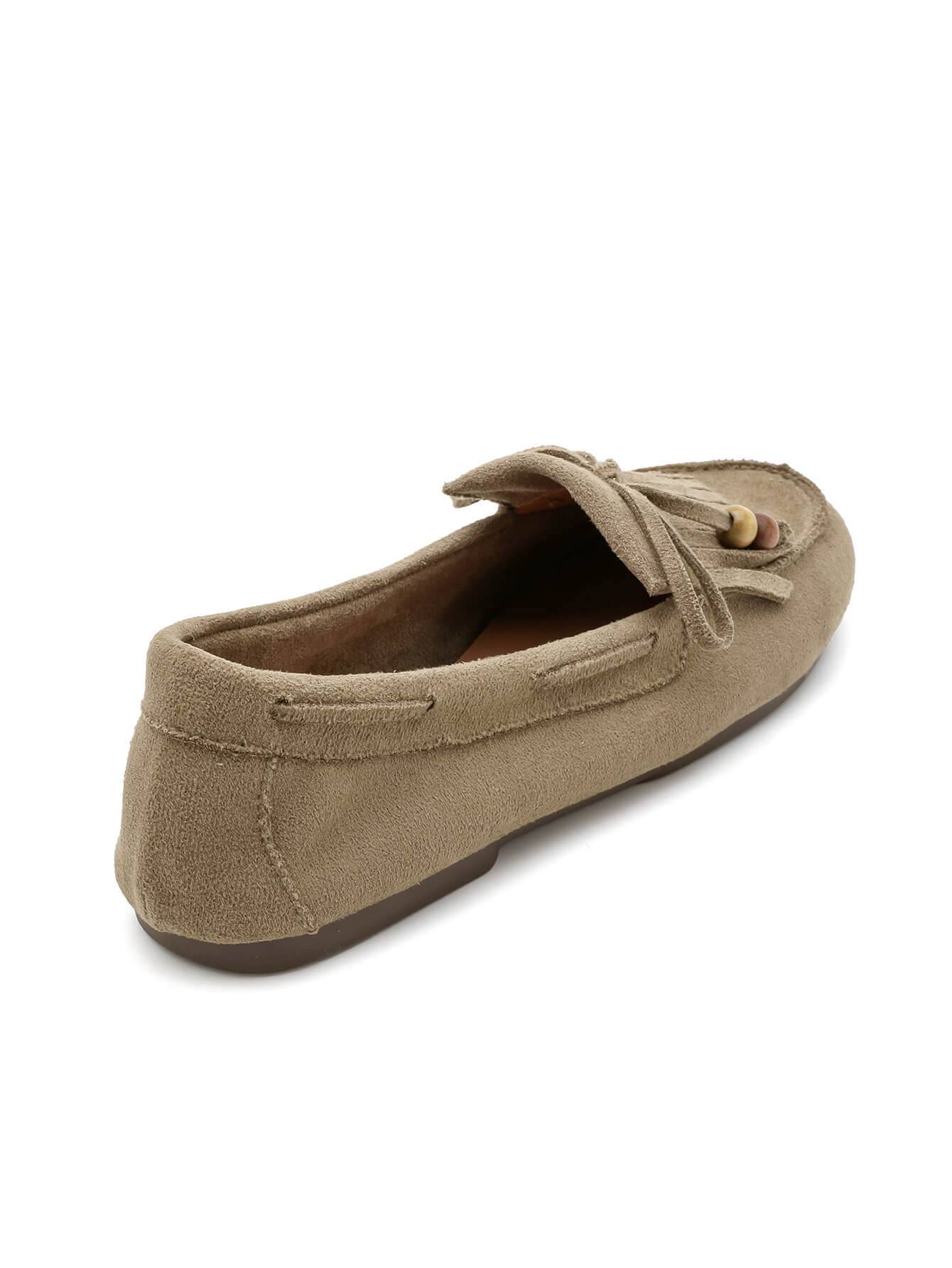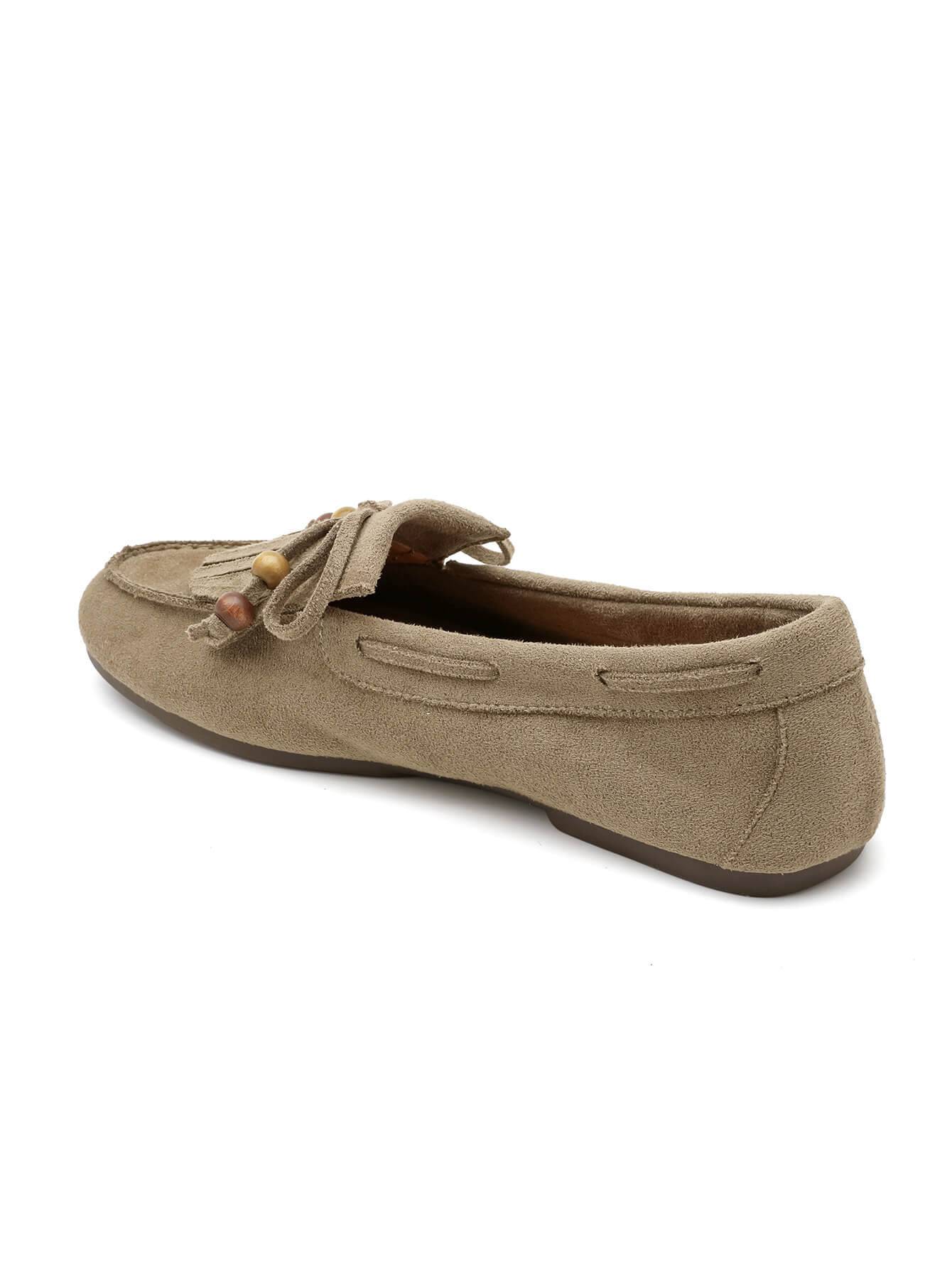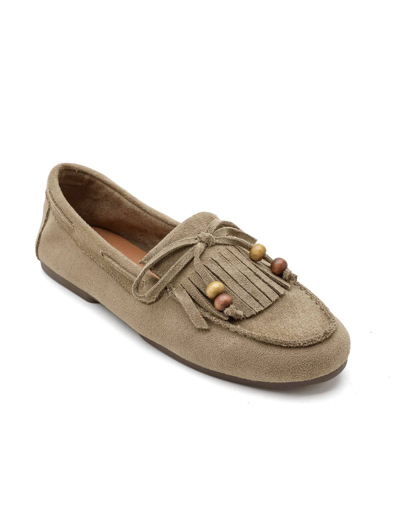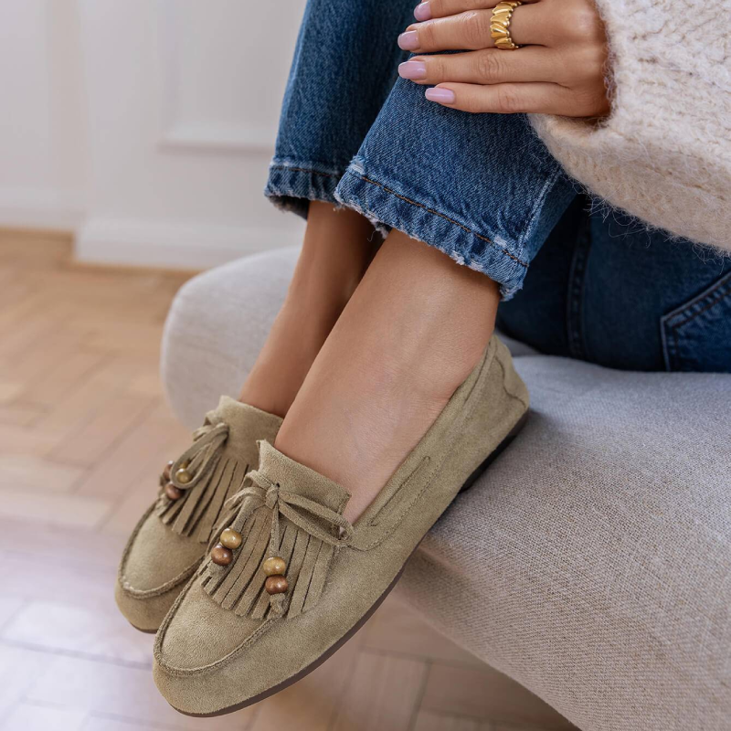 Κομψό γυναικείο μοκασίνι σε χακί απόχρωση, κατασκευασμένο από συνθετικό suede με υφή καστόρι. Διαθέτει διακοσμητικά κρόσσια και λεπτομέρειες με χάντρες που χαρίζουν φυσικό χαρακτήρα και ιδιαίτερο στυλ.Μαλακό και άνετο, αποτελεί ιδανική επιλογή για καθημερινές εμφανίσεις, συνδυάζοντας άνεση και διακριτική κομψότητα από το πρωί έως το βράδυ.