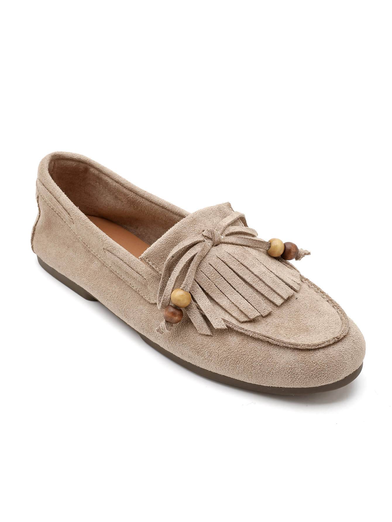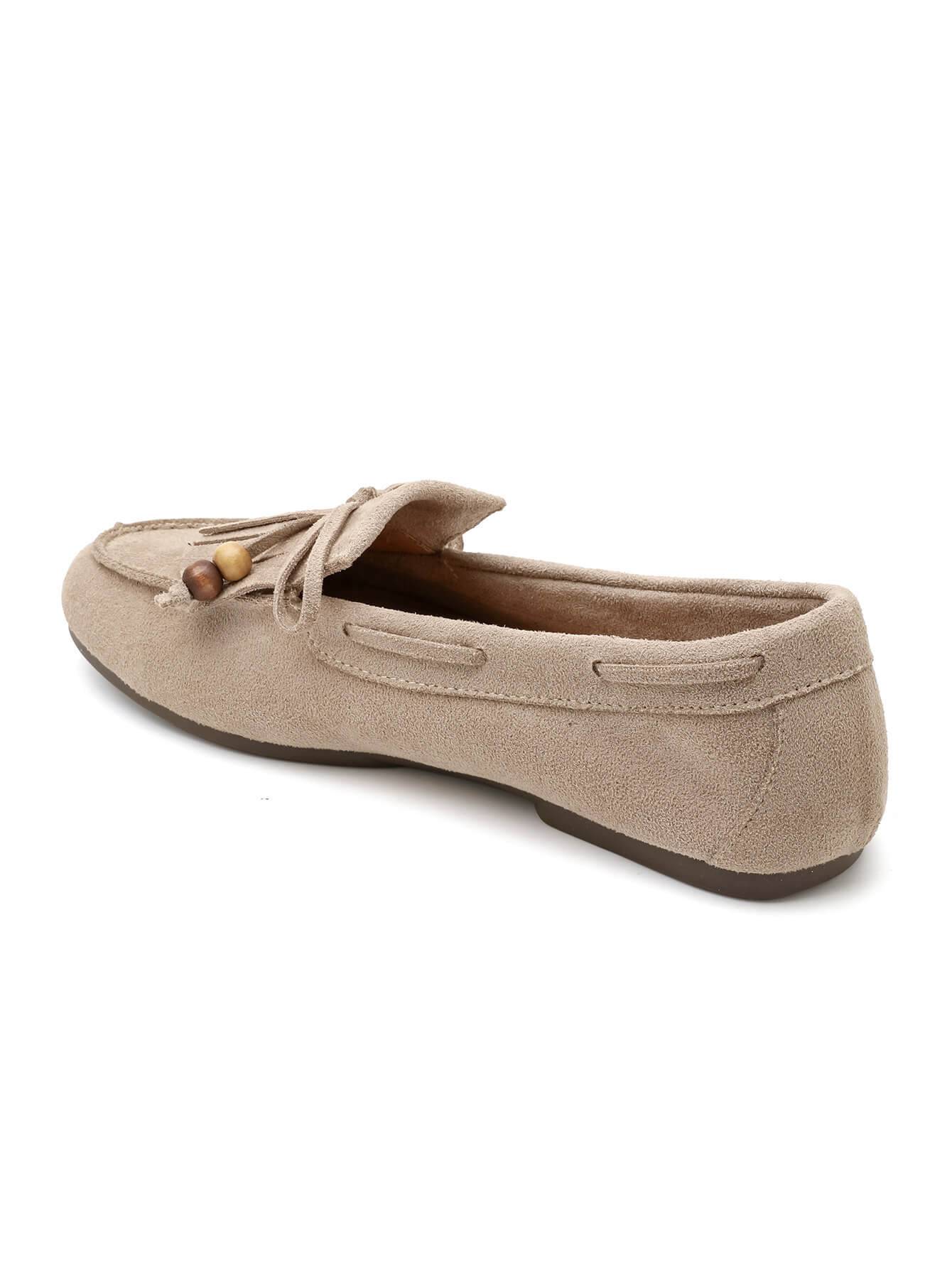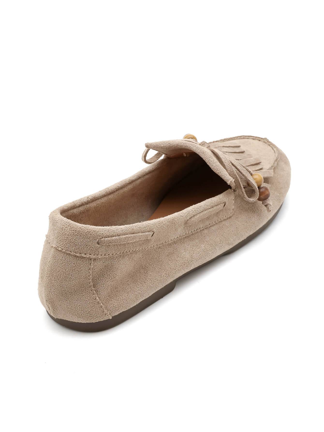 Κομψό γυναικείο μοκασίνι σε μπεζ απόχρωση, κατασκευασμένο από συνθετικό suede με υφή καστόρι. Διαθέτει διακοσμητικά κρόσσια και λεπτομέρειες με χάντρες που χαρίζουν φυσικό χαρακτήρα και ιδιαίτερο στυλ.Μαλακό και άνετο, αποτελεί ιδανική επιλογή για καθημερινές εμφανίσεις, συνδυάζοντας άνεση και διακριτική κομψότητα από το πρωί έως το βράδυ.