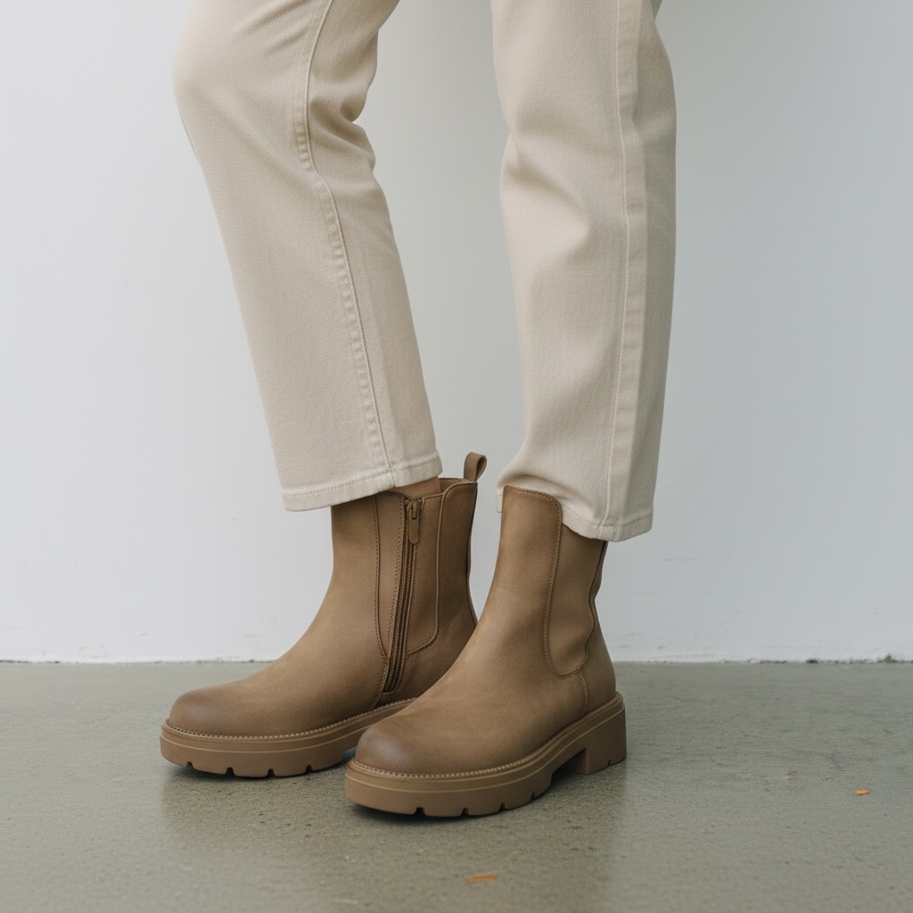 Ανανεώσε το καθημερινό σου στυλ με αυτό το χακι μποτάκι από δερματίνη με μοντέρνα ελαφριά τρακτερωτή σόλα. Ο ελαστικός του πάτος και το διακριτικό φερμουάρ στο πλάι προσφέρουν εύκολη εφαρμογή και άνεση όλη μέρα.