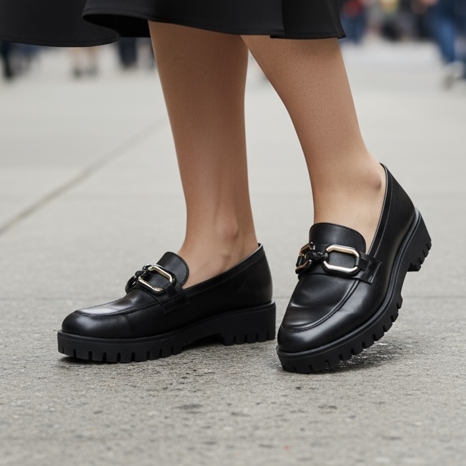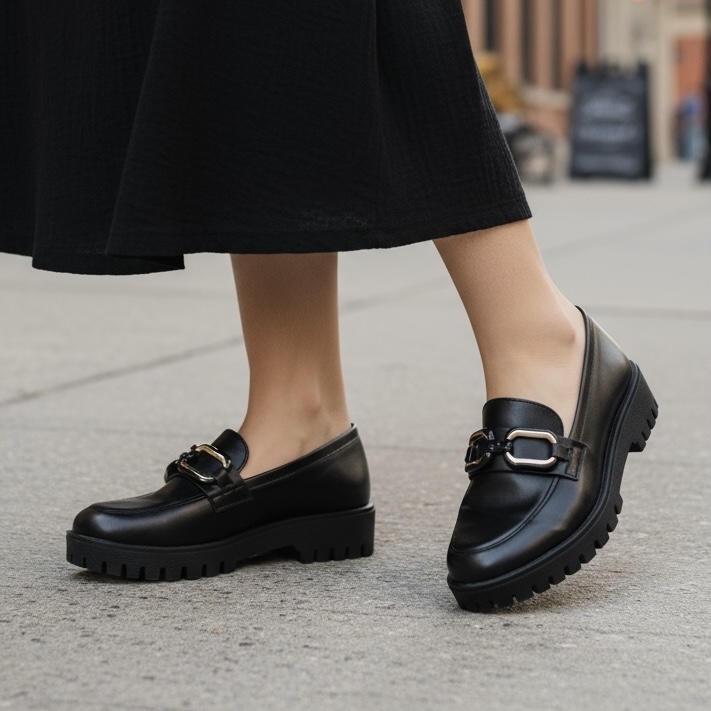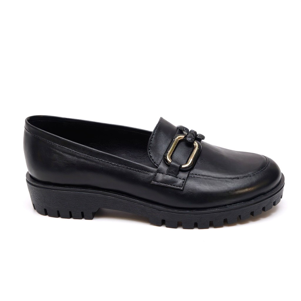Κομψά loafers σε minimal γραμμή, με μοντέρνα χρυσή αγκράφα στο επάνω μέρος.