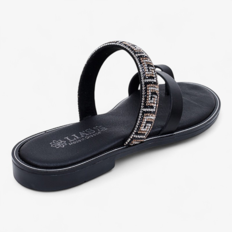 Κομψό flat σανδάλι με λουράκι δαχτύλου και εντυπωσιακή φάσα με στρας, ιδανικό για στυλάτες καλοκαιρινές εμφανίσεις. Είναι κατασκευασμένο από γνήσιο δέρμα και αποτελεί προϊόν ελληνικής κατασκευής, προσφέροντας άνεση και ποιότητα σε κάθε βήμα.