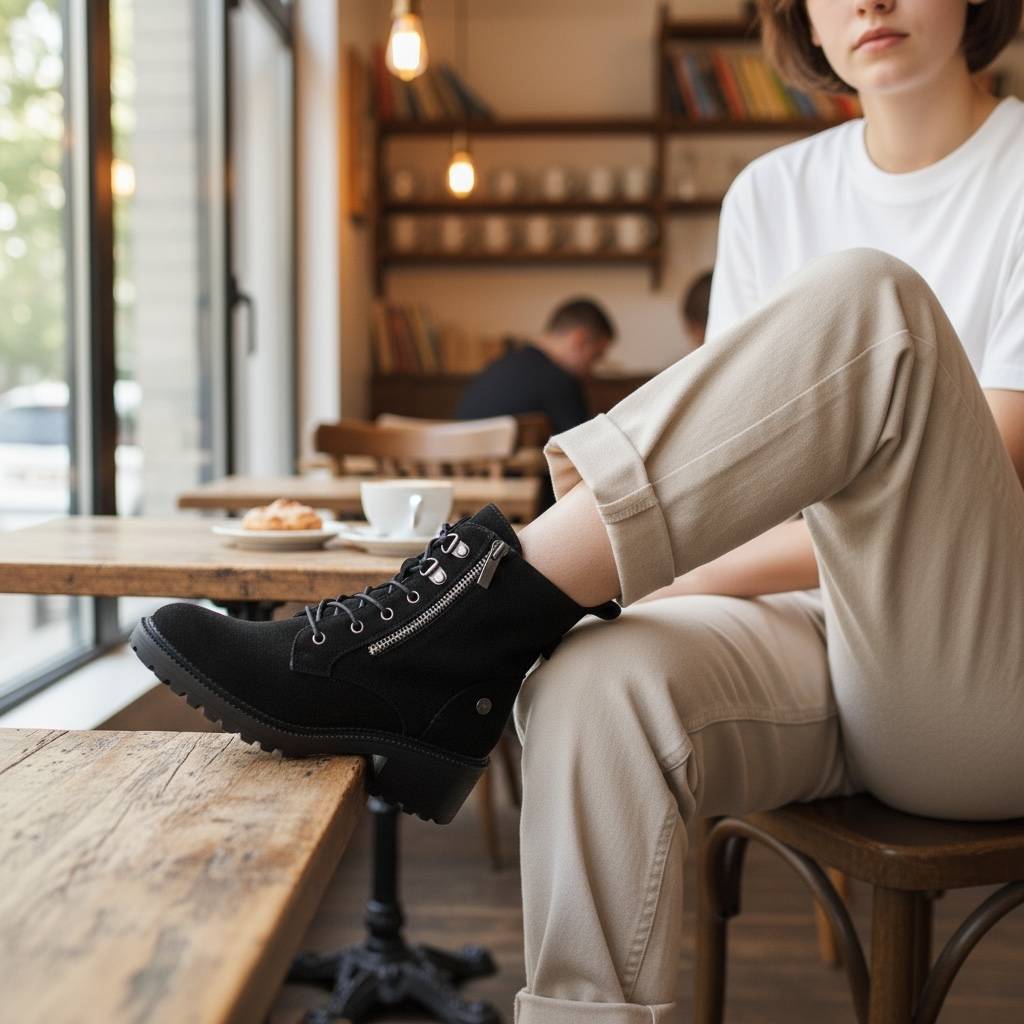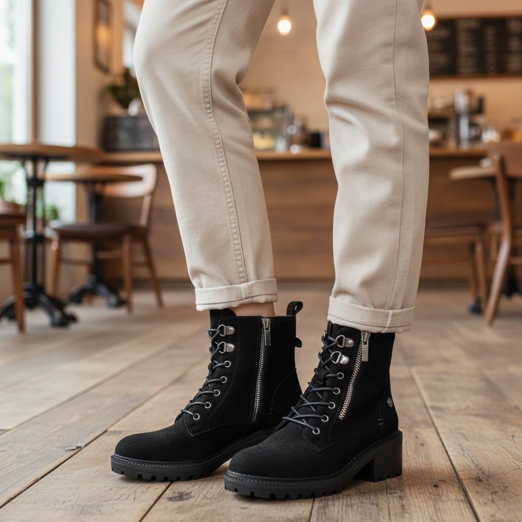 Εντυπωσιακά σουέτ μποτάκια που συνδυάζουν το military στυλ με τη θηλυκότητα.