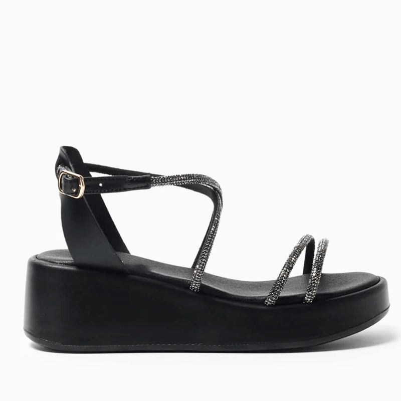 Πλατφόρμα δερμάτινη με strass λουράκια – Μαύρο