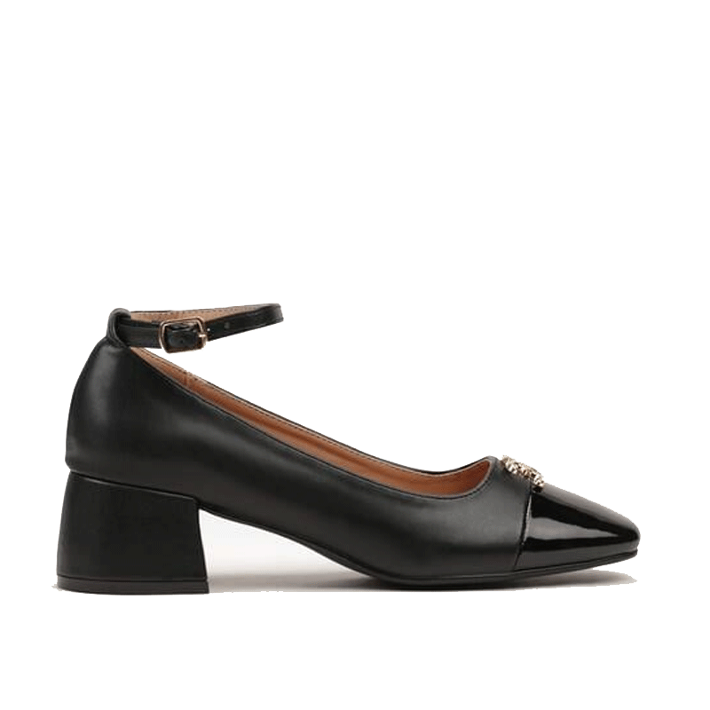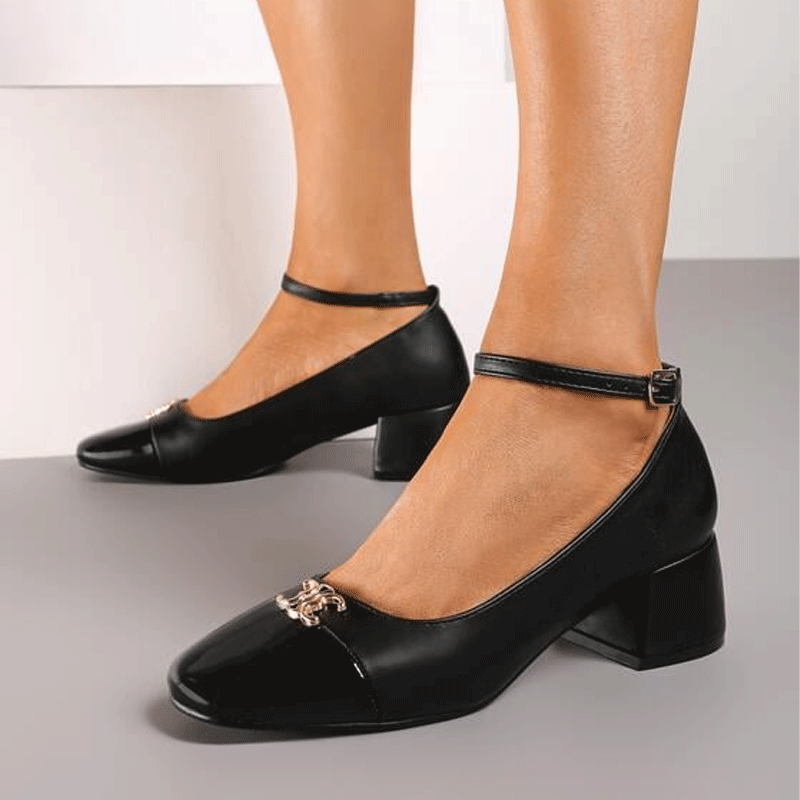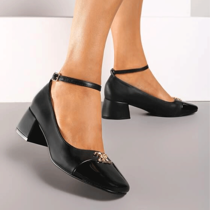 Γόβα καρέ γραμμή με μπαρέτα και με διακοσμητικό στοιχείο στο πάνω μέρος .Είναι ιδανική για μοναδικές και ανετες εμφανίσεις.